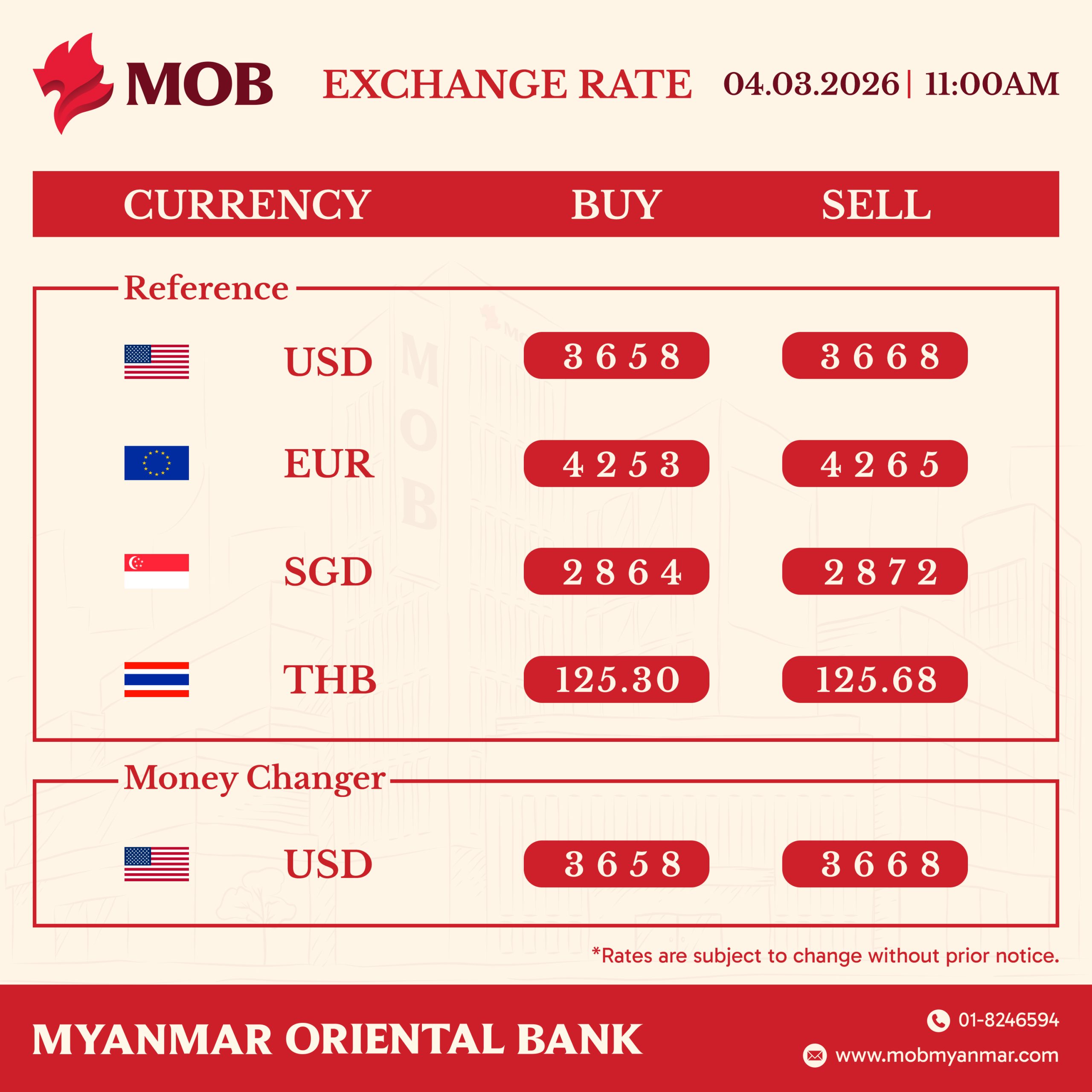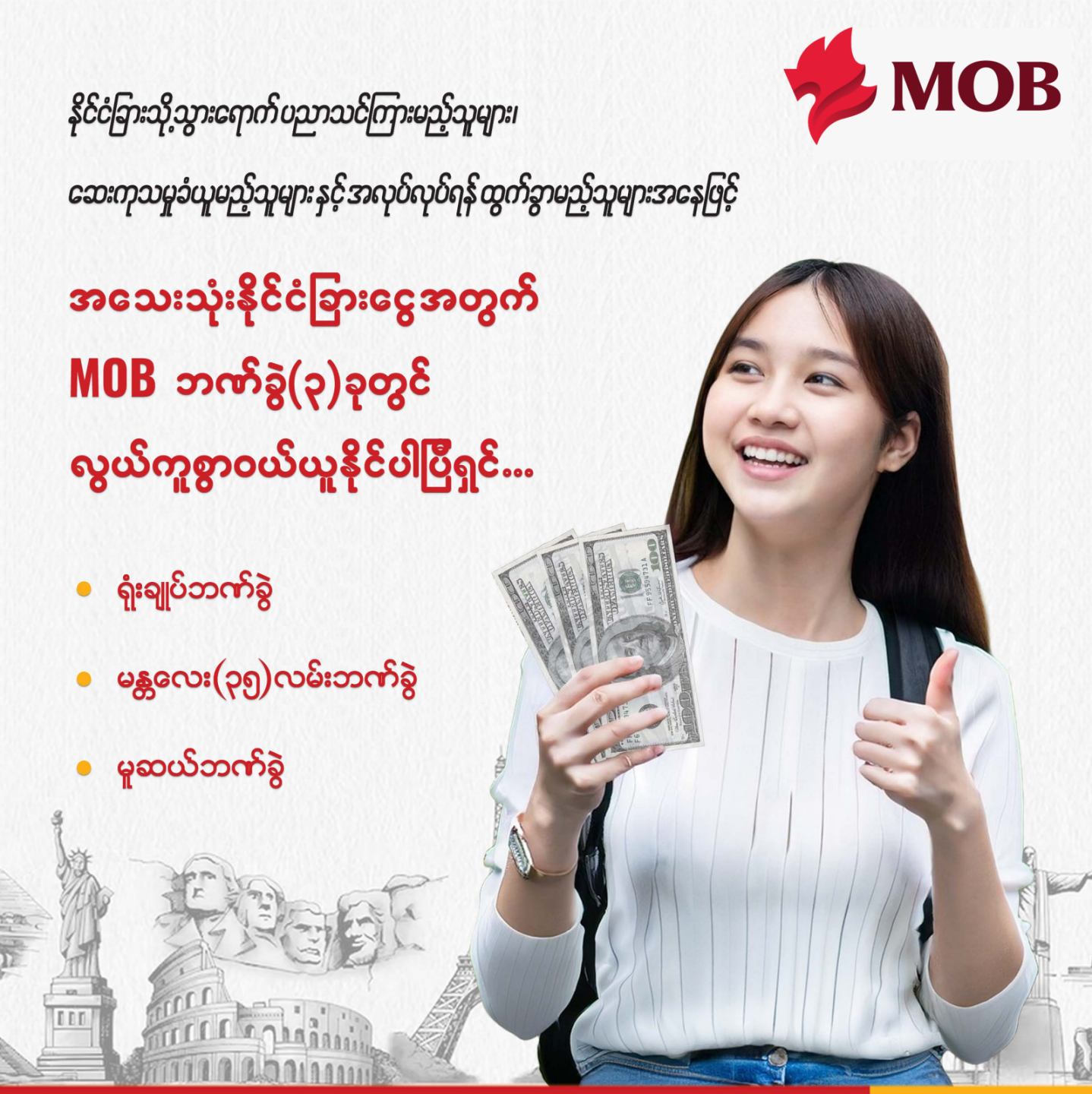 မြန်မာအရှေ့တိုင်းဘဏ် (MOB) နှင့် ဆက်သွယ်ဆောင်ရွက်လျက်ရှိသော မိတ်ဟောင်း၊မိတ်သစ် Customers လူကြီးမင်းများအား သတင်းကောင်းပါးပါရစေရှင်...