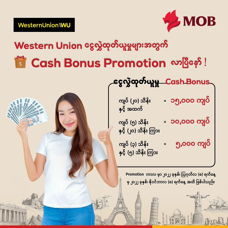 ၂၀၁၂ ခုနှစ်၊ နိုဝင်ဘာလမှစ၍ MOB ၏ Western Union ငွေလွှဲဝန်ဆောင်မှုကို အသုံးပြုလျက်ရှိသော မိတ်ဟောင်း၊ မိတ်သစ် Customers များကို ကျေးဇူးတုံ့ပြန်သောအားဖြင့် MOB တွင် Western Union ငွေလွှဲများ ထုတ်ယူပြီး ငွေသားလက်ဆောင်များ ရရှိနိုင်မည့် ပရိုမိုးရှင်းအစီအစဥ်အားစတင်လိုက်ပါသည်။ မြန်မာအရှေ့တိုင်းဘဏ် (MOB) ရုံးချုပ်နှင့် ရန်ကုန်၊ နယ်ဘဏ်ခွဲများ အားလုံးတွင်...